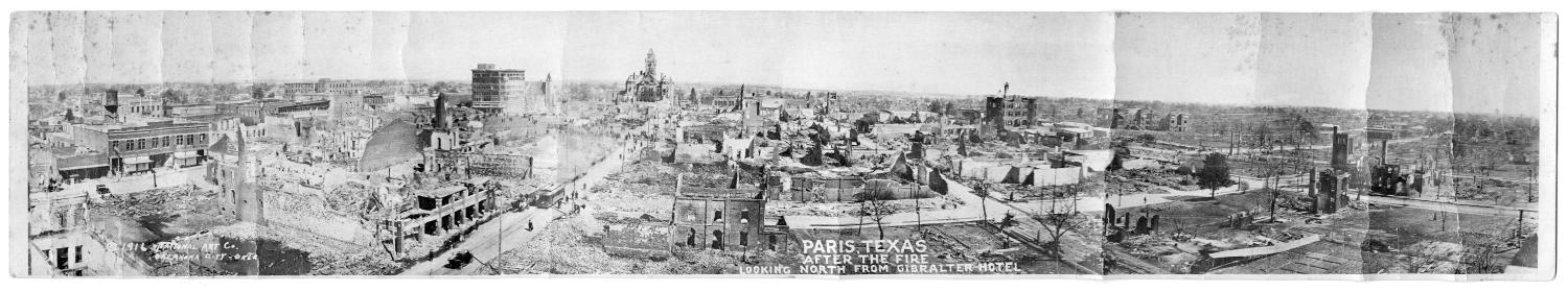 Bottom Photo: National Art Co. [Panoramic photo of Paris after the 1916 fire], photograph, 1916; (https://texashistory.unt.edu/ark:/67531/metapth41749/: accessed March 19, 2021), University of North Texas Libraries, The Portal to Texas History, https://texashistory.unt.edu; crediting Private Collection of Joe E. Haynes.