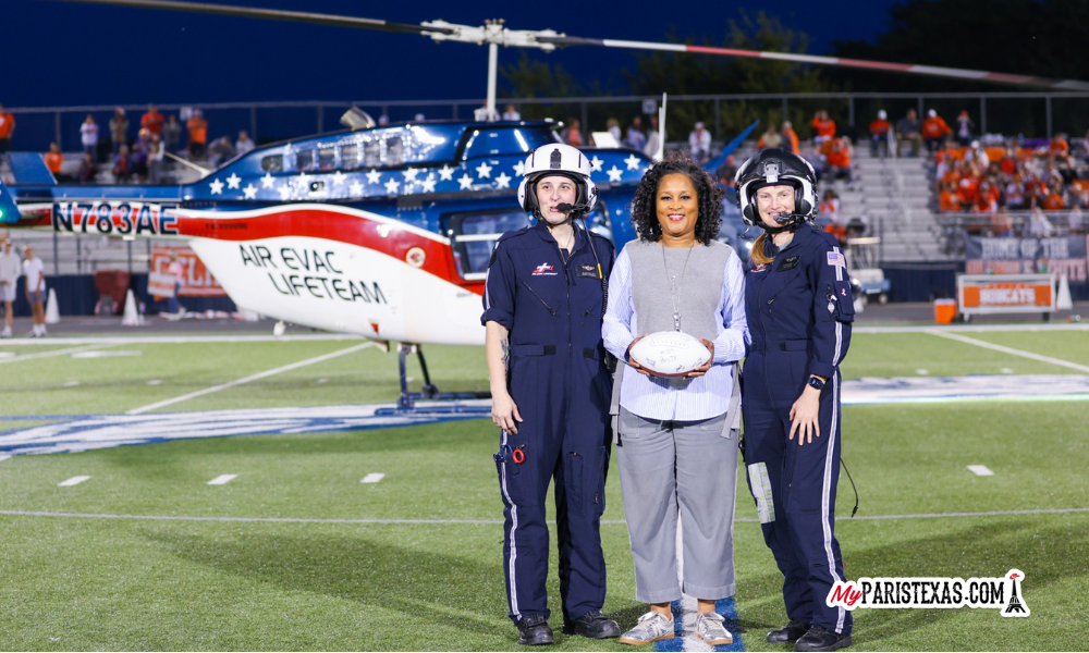 At Thursday night’s game, the Air Evac Lifeteam #139 helicopter, based here in Paris, TX, and the crew consisting of Rebecca Parson, Flight RN, EMT, Amber LaPointe, Flight Paramedic, and Pilot Brian Rousche delivered the souvenir game ball to Paris ISD Superintendent Althea Dixon on the Home Team’s sidelines, accompanied by Flight Paramedic Bill Cross.