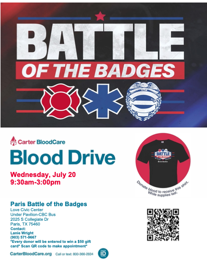 For more information on the upcoming blood drive, contact Lane Wright at 903-571-9667. To schedule an appointment, click here or scan the QR code in the image above.