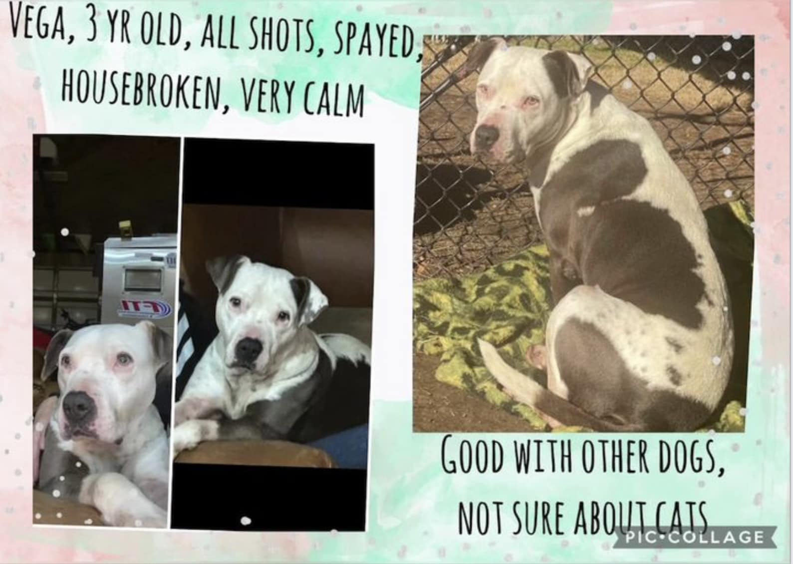 She had a cyst on her belly that was surgically removed and it was cancer and all removed. She’s had a very rough life and deserves a loving home as she is the sweetest baby girl. She is housebroken, gets along with other dogs, We’re not sure about cats and does not need to be around cattle.