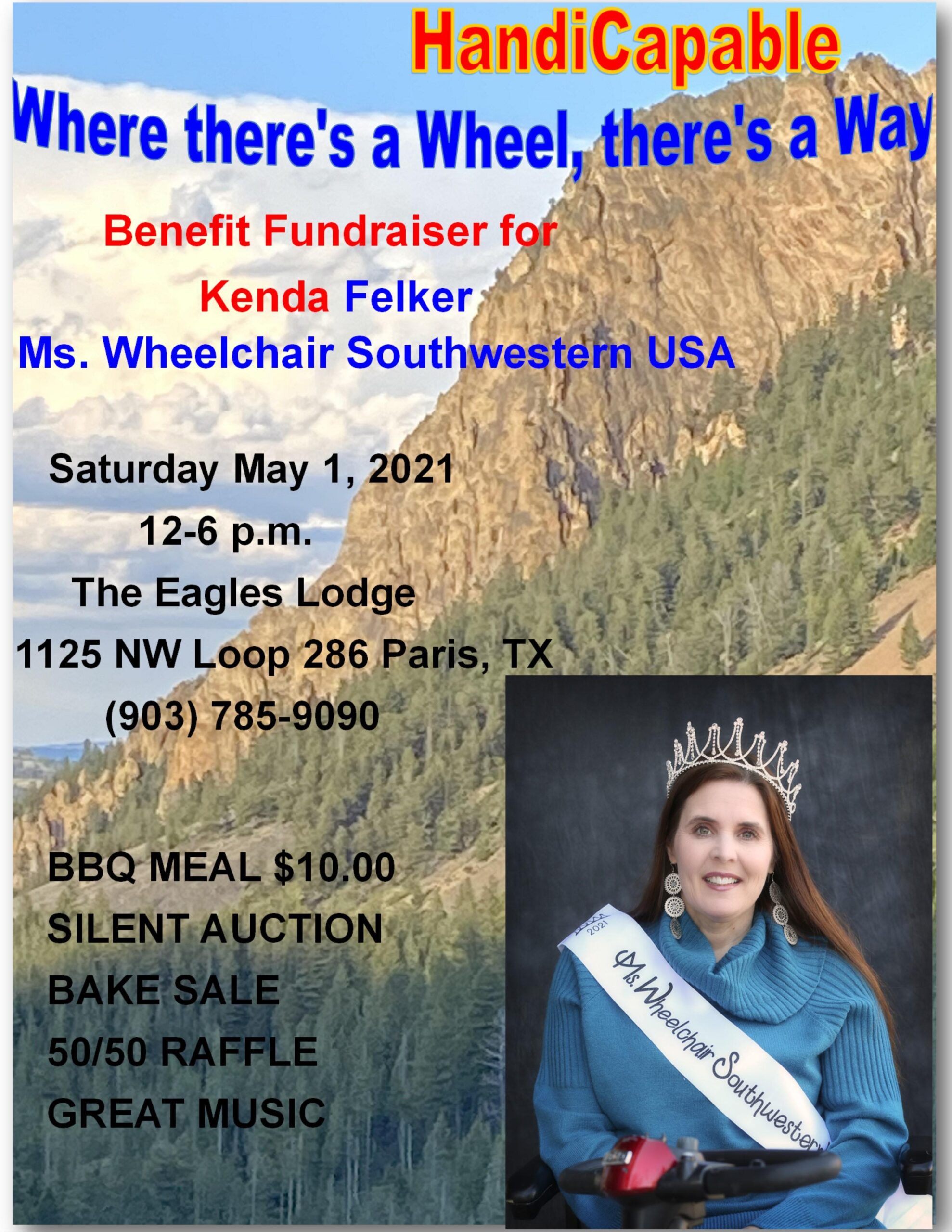 A barbecue fundraiser benefit for Kenda Felker, Ms. Wheelchair Southwestern USA, is set for May 1 at The Eagles Lodge.