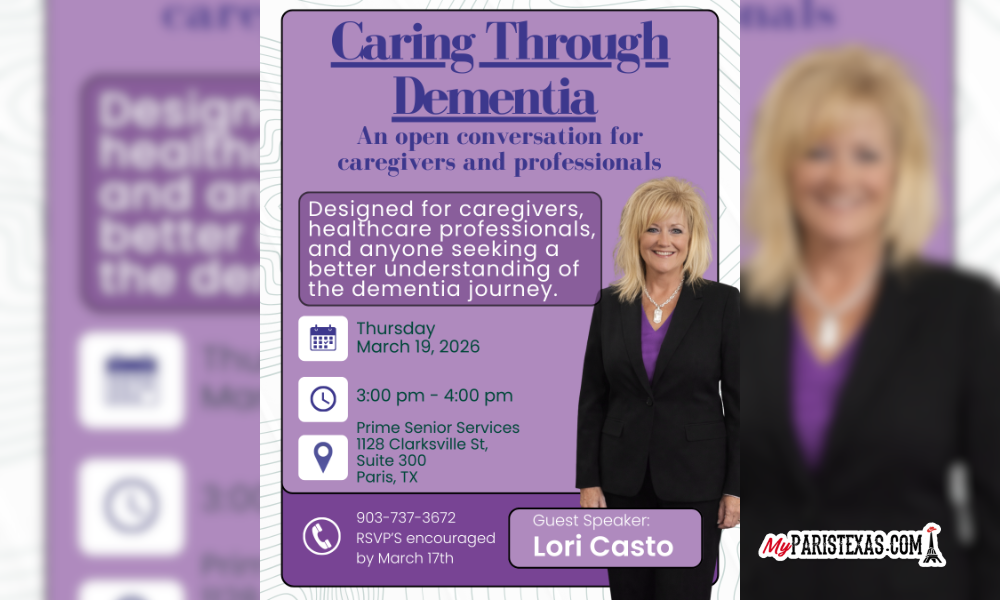 Paris Regional Health Prime Center invites caregivers, healthcare professionals, and anyone seeking a better understanding of the dementia journey to a special educational session, “Caring Through Dementia: An Open Conversation”, on Thursday, March 19, from 3–4 p.m. at Prime Senior Services, 11228 Clarksville Street, Paris, Texas.