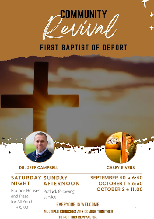 Everyone is welcome to an upcoming community revival, put together by multiple churches in the surrounding area, at First Baptist of Deport from Sept. 30-Oct. 2.