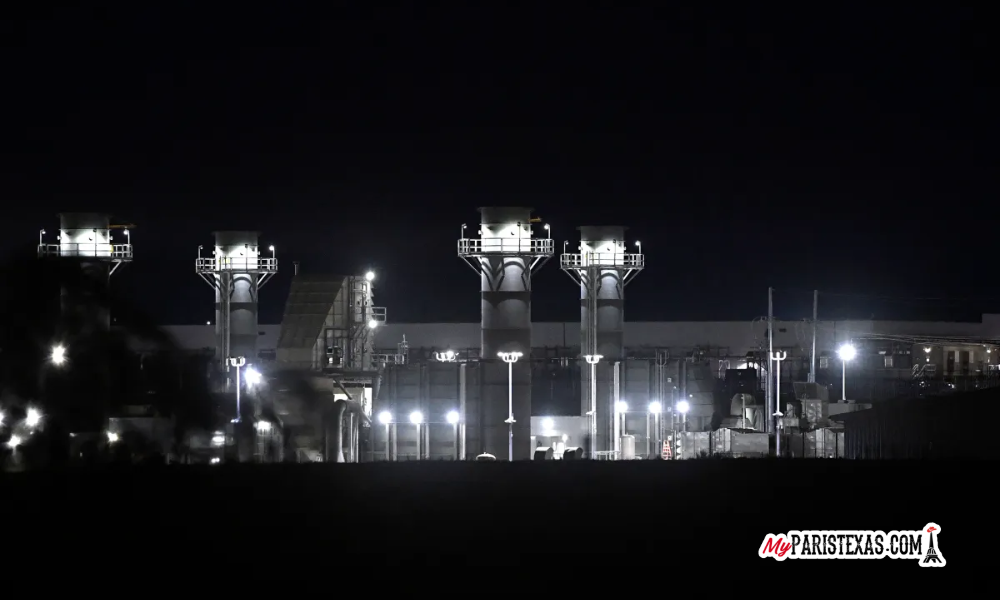 Photo Credit: Gas turbine towers are lit outside the Abilene DC1 Stargate Project data center in Abilene on April 21, 2026. Ronald W. Erdrich for The Texas Tribune