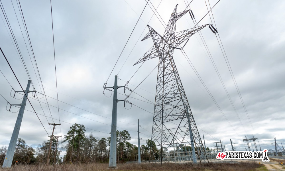 Photo Credit: Power lines stretch across the sky over a substation outside of Nacogdoches on Jan. 26, 2024. Leslie Nemec for The Texas Tribune