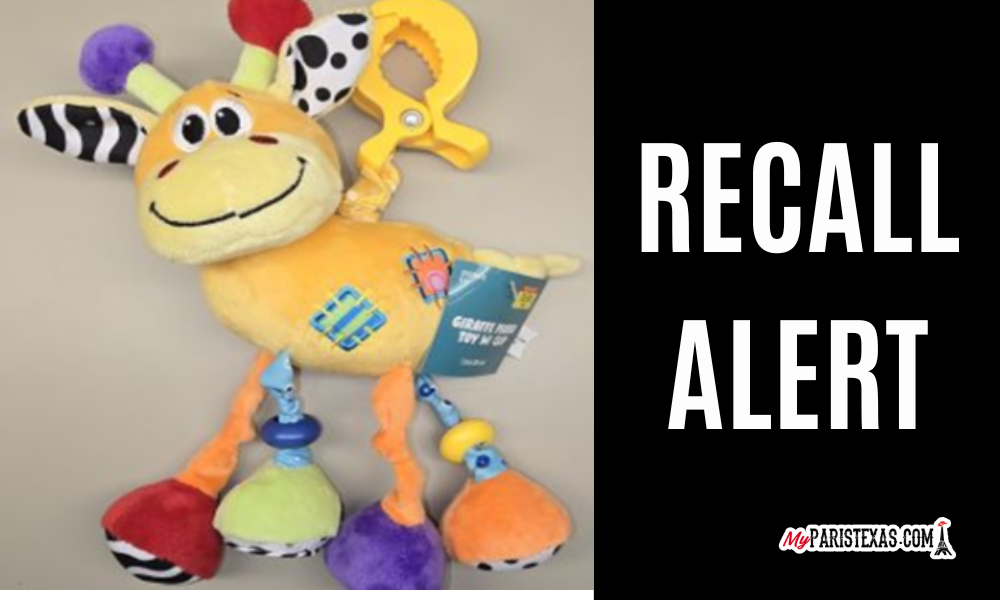 Description: This recall involves a Giraffe Plush Toy with clip and a Llama Plush Toy with clip. The Giraffe with clip has a yellow body with a yellow claw clip. The legs of the giraffe are orange and blue with various colored paws. The ears are black and white animal print. The Giraffe measures about nine inches long. The Giraffe has “HL699436 or HL731481” printed on the white sewn-in label. The hang tag on the Giraffe has “2553675” printed on the front left corner. The Llama with clip has a white body with a green claw clip. The body has a mirror and orange triangle teether attached to the body. The legs of the Llama are orange and yellow with various colored paws. The Llama measures about 12 inches long. “HL699436” is printed on the white sewn-in label attached to the body. The hang tag on the plush has “2553634” printed on the front left corner.