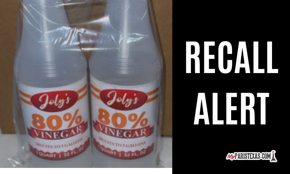 Description: This recall involves Joly’s 80% Vinegar (32-ounce, pack of two). The vinegar comes in a white capped transparent bottle with an orange and red label with white lettering that has “Joly’s” brand, “80% Vinegar” and “Dilutes to 5 Gallons”. There are no other markings on the container.