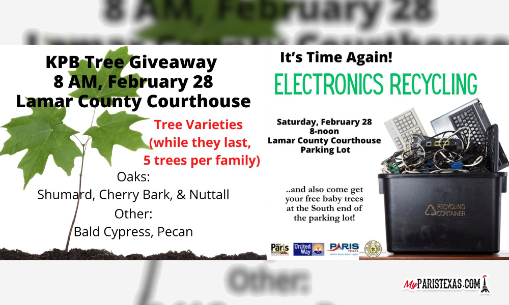 Keep Paris Beautiful will hold its annual Tree Giveaway and Electronics Recycle event on Feb. 28 in the Lamar County Courthouse parking lot.