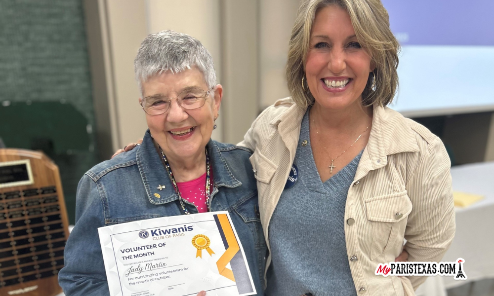 Photo: Kiwanis Club of Paris president Shannon Jones, right, presents Judy Martin with a certificate for being the volunteer of the month for October. Mrs. Martin helped local organizations to the tune of 68 hour