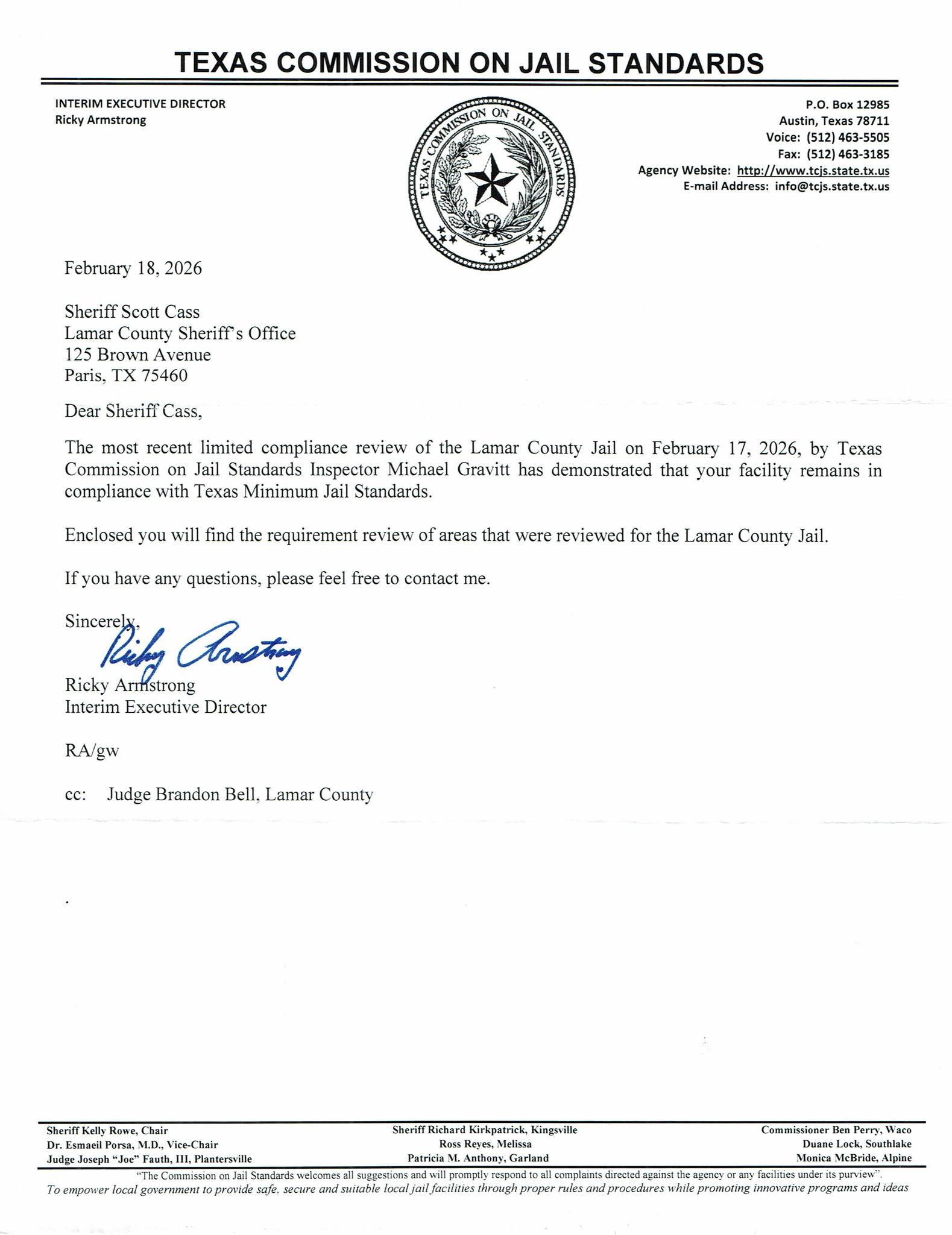 The Texas Commission on Jail Standards conducted a limited compliance review of the Lamar County Jail on Feb. 17, 2026.