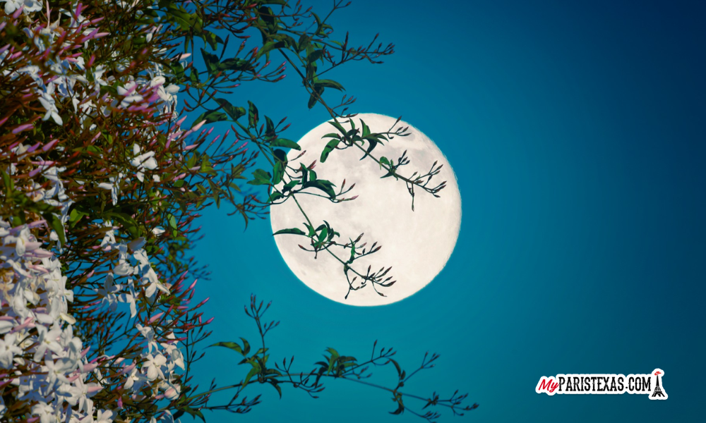 Photo Credit: space.com | A full moon pictured behind a blooming Jasmine plant. (Image credit: Getty Images, Lee Sie Photography