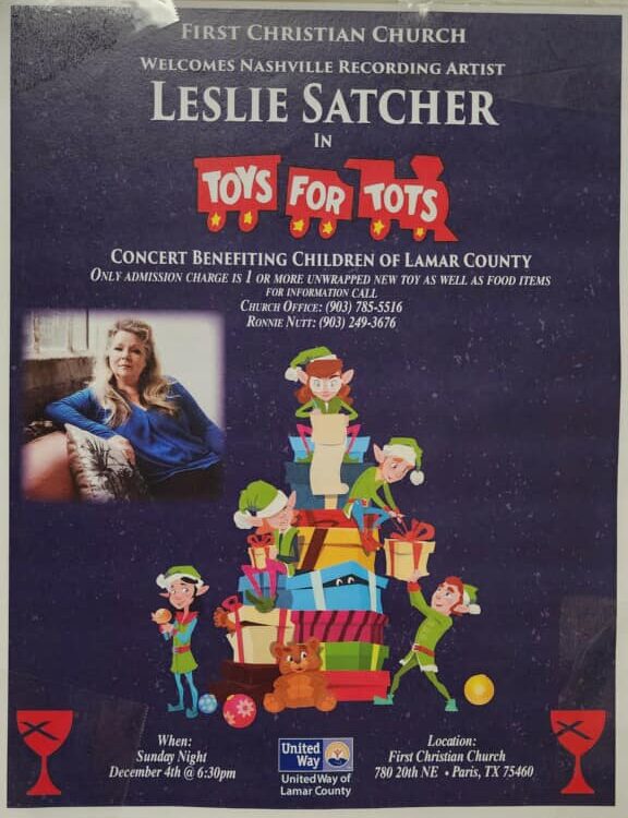 Benefiting the children of Lamar County, Leslie Satcher, country singer and songwriter from Paris, is set to perform during a food and toy drive on Sunday, Dec. 4, at First Christian Church, 780 20th St NE.