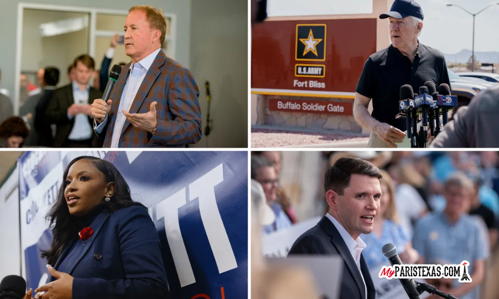 Photo Credit: Top from left: Ken Paxton and incumbent John Cornyn, Republican candidates for U.S. Senate. Lower from left: Democratic candidates Jasmine Crockett and James Talarico. The Texas Tribune
