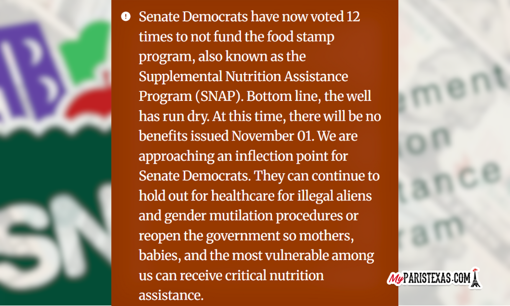 “Senate Democrats have now voted 12 times to not fund the food stamp program, also known as the Supplemental Nutritional Assistance Program (SNAP),” the notice reads. “Bottom line, the well has run dry.”