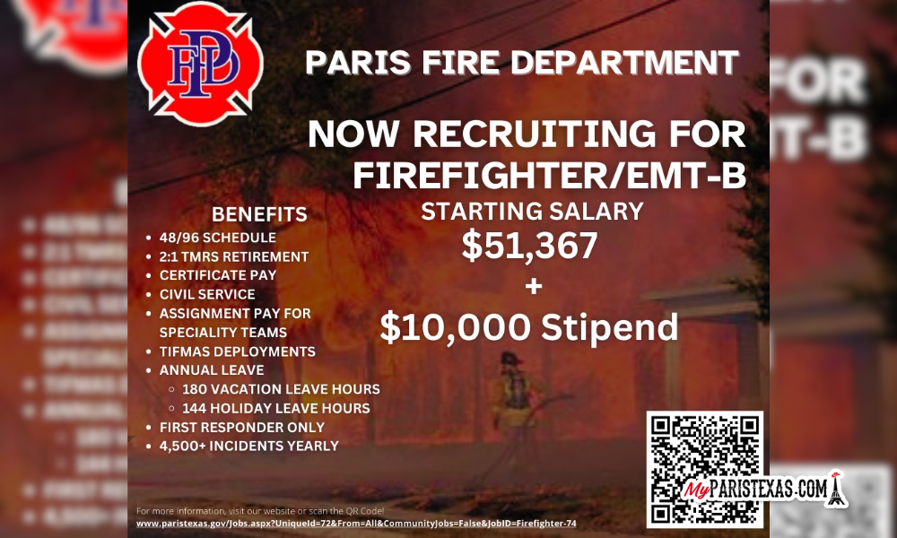 The Paris Fire Department will be holding an examination on Feb. 24, 2026, at 5 p.m. for a Firefighter/EMT-B.