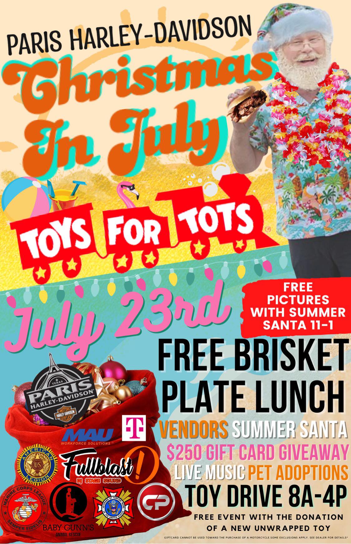 Free brisket plate lunch, free pictures with summer Santa, an opportunity to win a $250 gift card alongside a pet adoption are all planned in the same spot on the same day during the Paris Harley-Davidson Christmas in July on July 23.