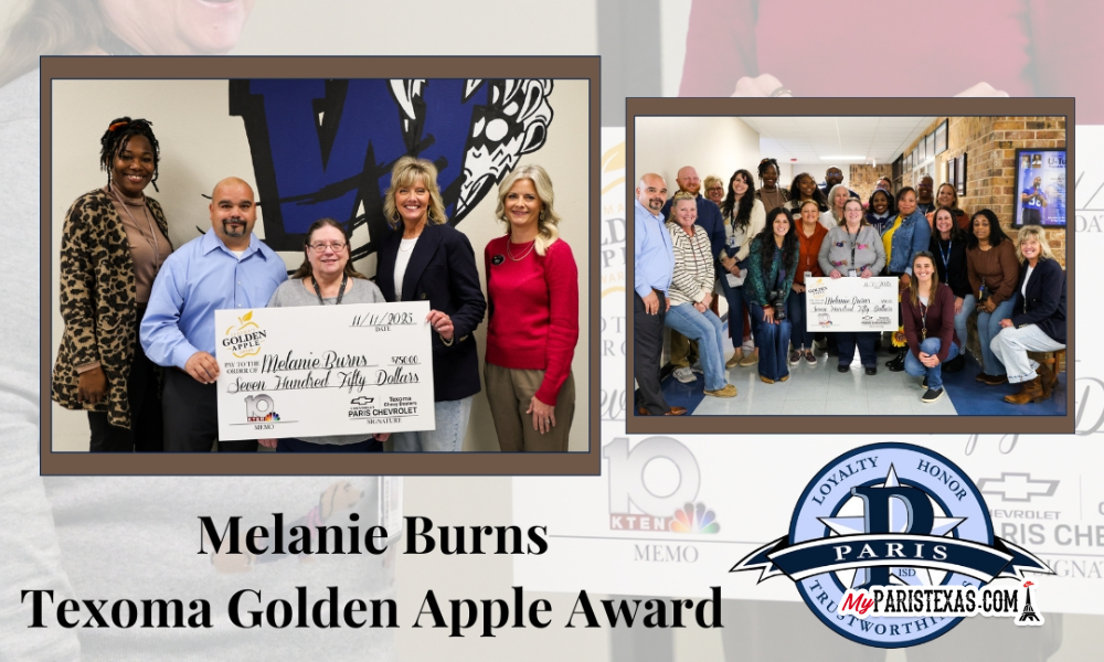 Paris Junior High School secretary Melanie Burns has been named the recipient of Texoma’s Golden Apple Award by KTEN Television and Texoma Chevy Dealers. Burns was surprised with the honor at a school assembly, where she was presented with a $750 check as Texoma’s Golden Apple of the Month.