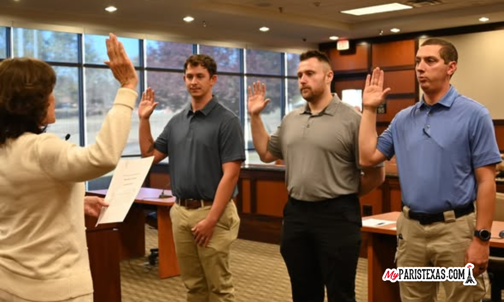 Pictured: December 8, 2025, being sworn in by City of Paris City Clerk Janice Ellis, from left to right, are Officer Westin Wible, Officer Nicholas Brincefield, and Officer Noah Palmer.