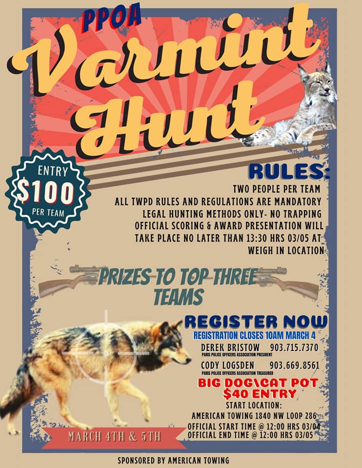 The 2023 Paris Police Officers Association Annual Varmint Hunt, sponsored by American Towing, is set to kick off on March 4, and registration to enter is underway.