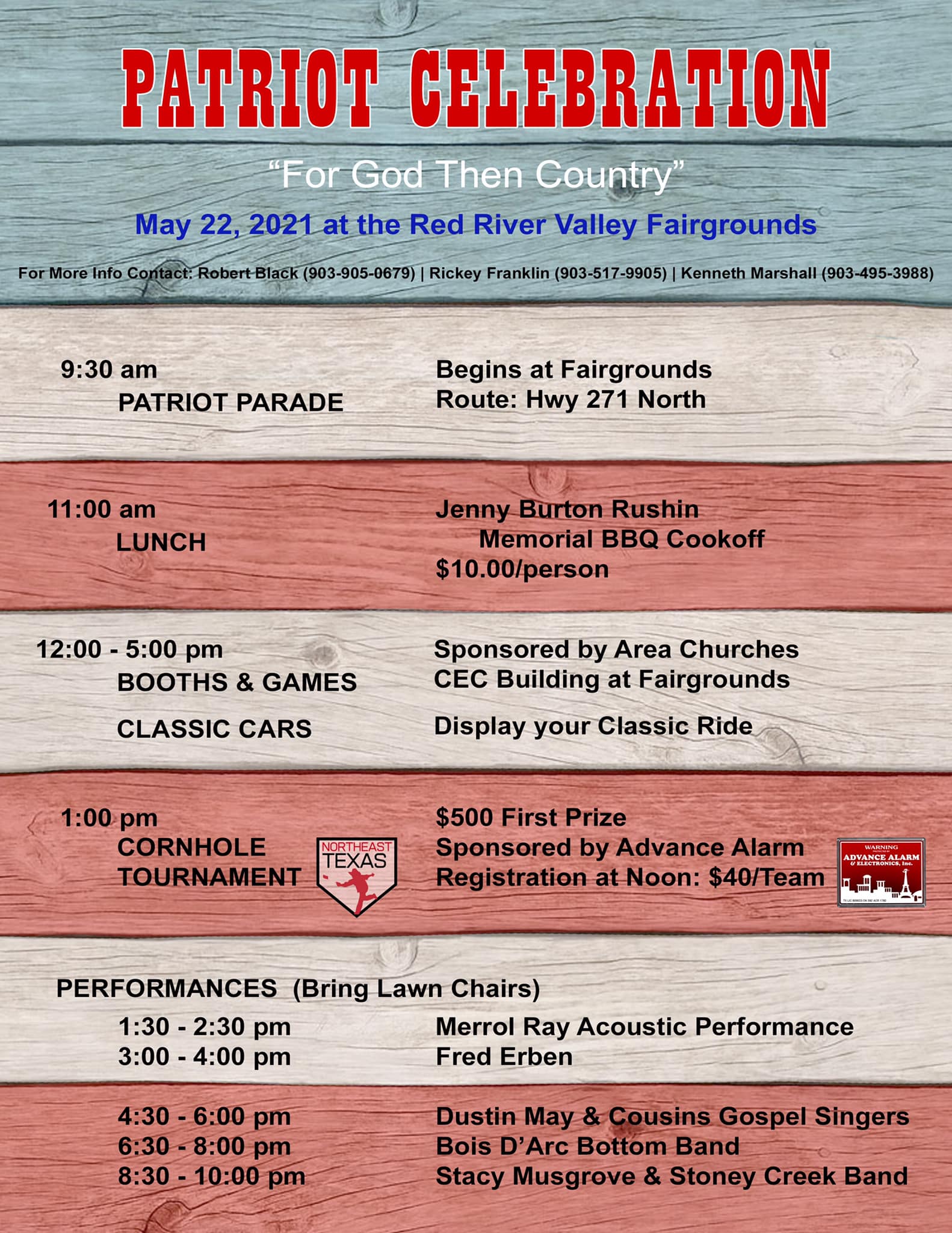 For more information about the Patriot Celebration festivities, contact Robert Black at 903-905-0679, Rickey Franklin at 903-517-9905 or Kenneth Marshall at 903-495-3988.