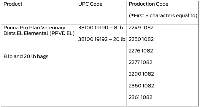 Nestlé Purina PetCare Company is voluntarily recalling select lots of Purina Pro Plan Veterinary Diets EL Elemental (PPVD EL) prescription dry dog food due to potentially elevated levels of vitamin D. Vitamin D is an essential nutrient for dogs; however, ingestion of elevated levels can lead to health issues depending on the level of vitamin D and the length of exposure. Vitamin D toxicity may include vomiting, loss of appetite, increased thirst, increased urination, and excessive drooling to renal (kidney) dysfunction.