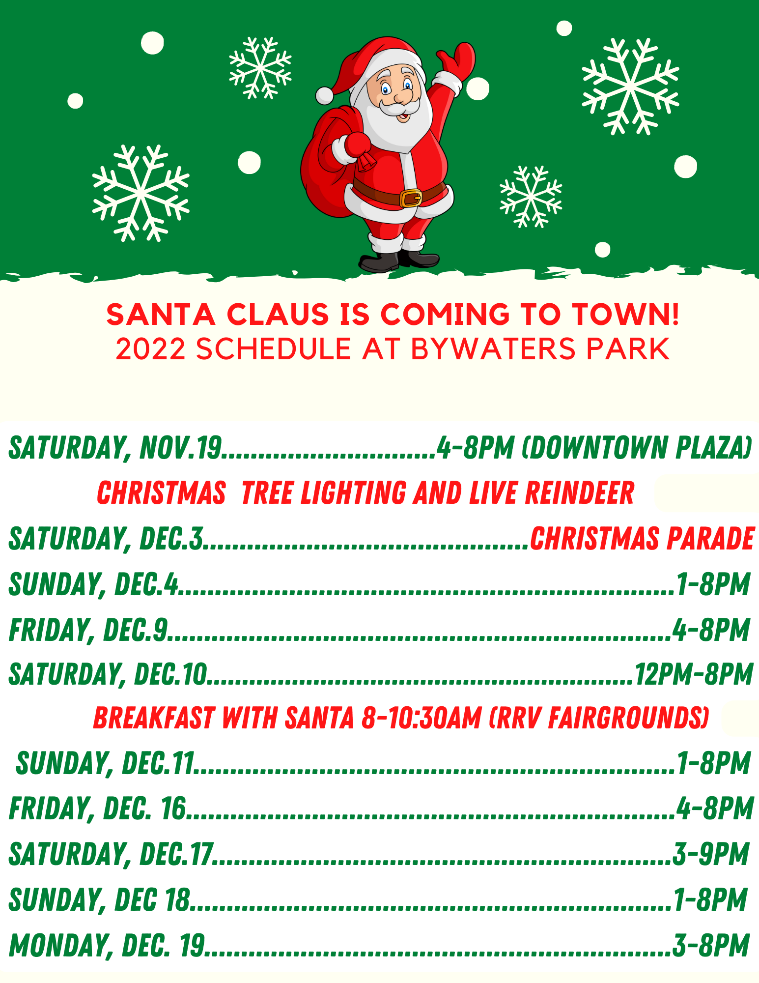 Santa’s holiday schedule showing when he will be at Bywaters Park can be found here: