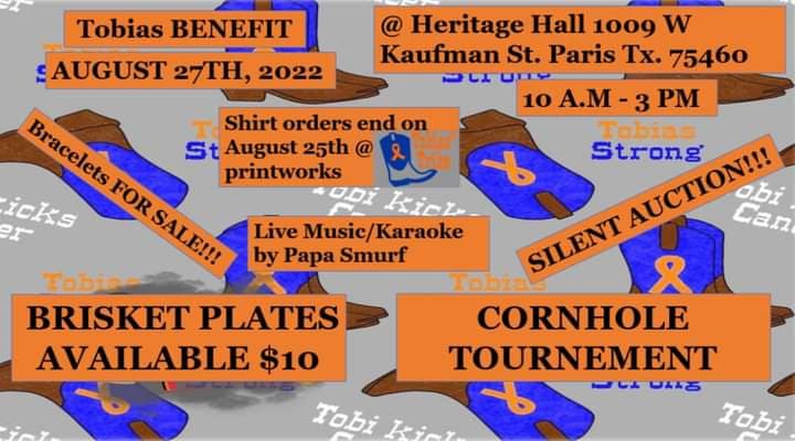 A Cornhole Tournament, alongside a brisket and silent auction fundraiser to benefit Tobias John Gonzales is set for Saturday morning from 10 a.m.-3 p.m.