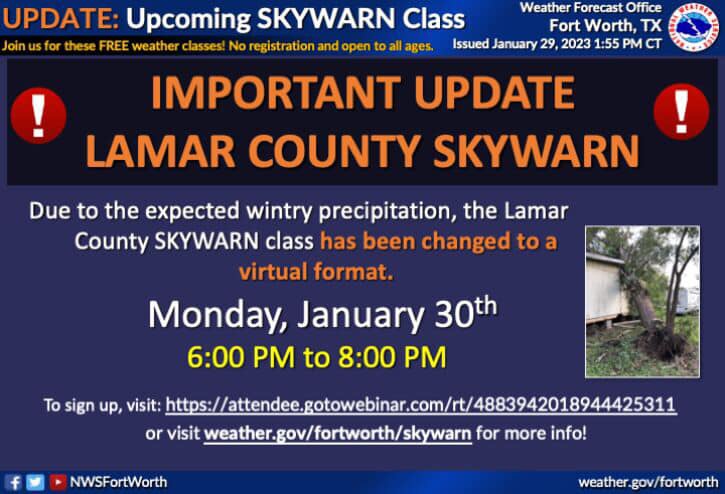 The National Weather Service (NWS) Office out of Fort Worth will be conducting a free severe weather training class for Lamar County on Monday, January 30th , 2023, from 6:00 PM to 8:00 PM at the Paris Police Department.
