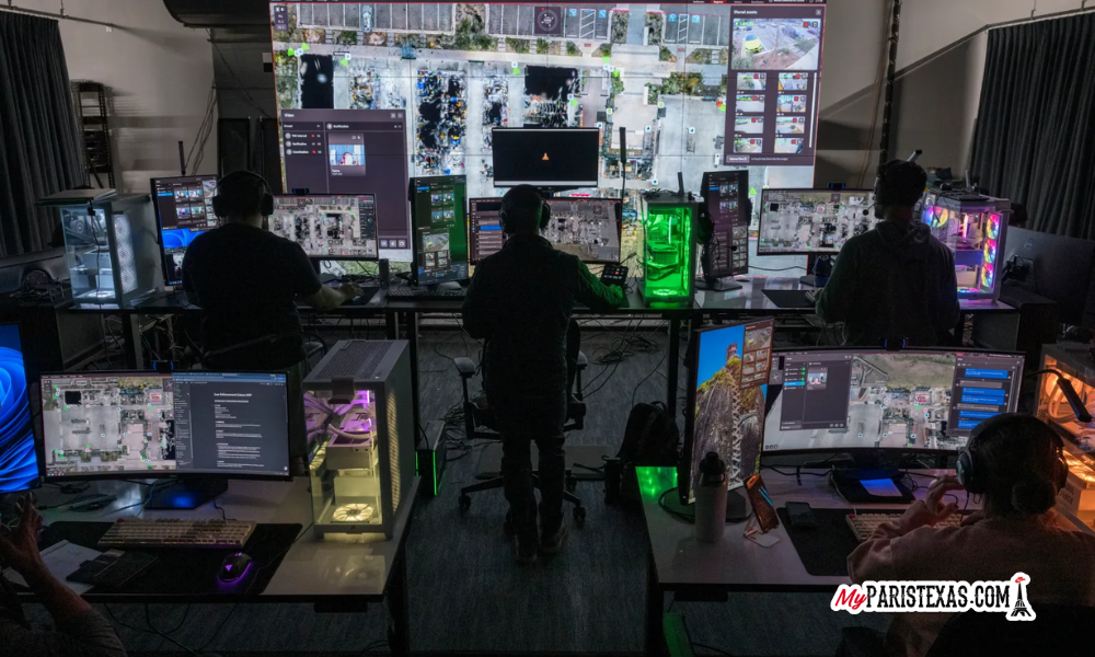 Photo Credit: Members of Campus Guardian Angel’s Tactical Operations Command (TOC) team monitor video feeds and other information while conducting a virtual emergency exercise at the company’s headquarters in Austin on Tuesday, Jan. 13, 2026. Guardian Angel has constructed a TOC center featuring various stations for team members and a large screen to monitor live data from potential emergencies, similar to governmental operations centers. Eli Hartman for The Texas Tribune