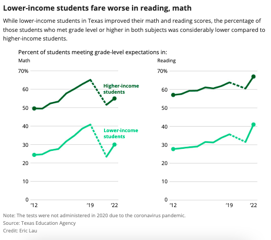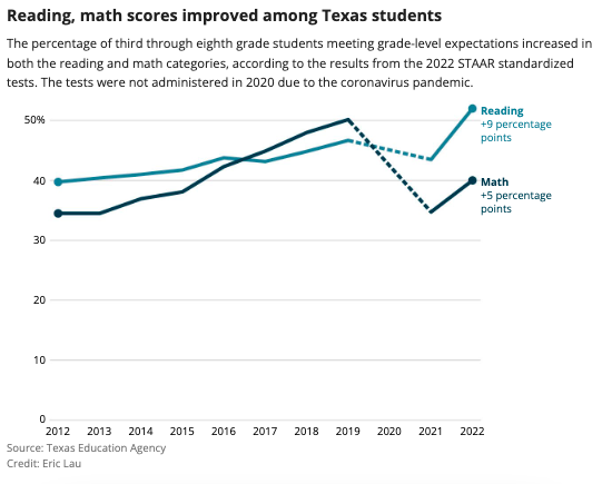 While the 2021-22 scores showed improvements in math for third- through eighth-graders current math levels remain 10 percentage points under the 2019 math levels. Texas had been making successful strides in math scores since 2012, when only 34% of students met grade level or above.