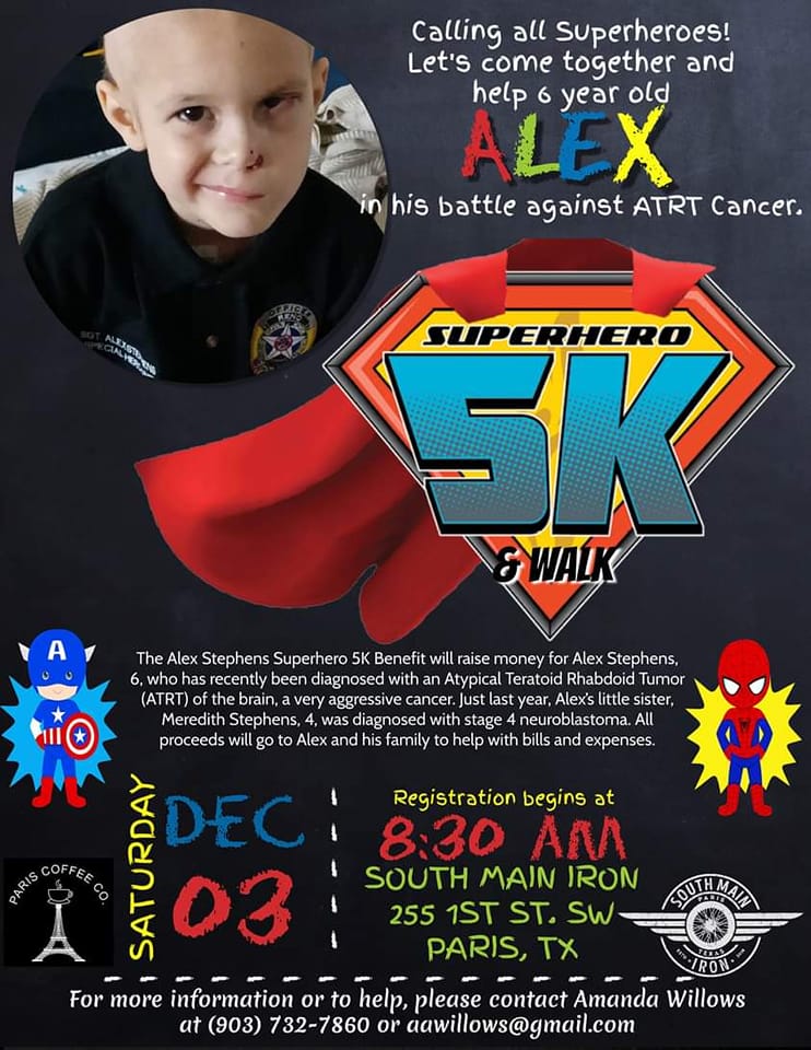 The Alex Stephens Superhero 5K & Walk Benefit this Saturday will raise money for Alex Stephens, 6, who was recently diagnosed with an Atypical Teratoid Rhabdoid Tumor (ATRT) of the brain, a very aggressive cancer. Just last year, Alex’s little sister, Meredith Stephens, 4, was diagnosed with stage 4 neuroblastoma.