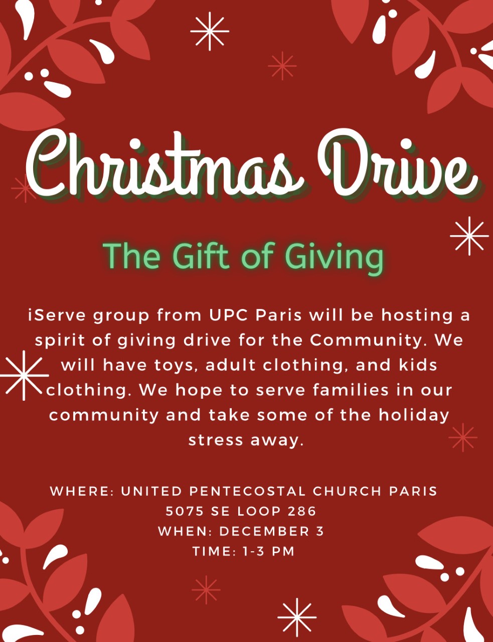 United Pentecostal Church of Paris’ Spirit of Giving Drive will be from 1-3 p.m. on Dec. 3 at UPC Paris, 5075 S.E. Loop 286.
